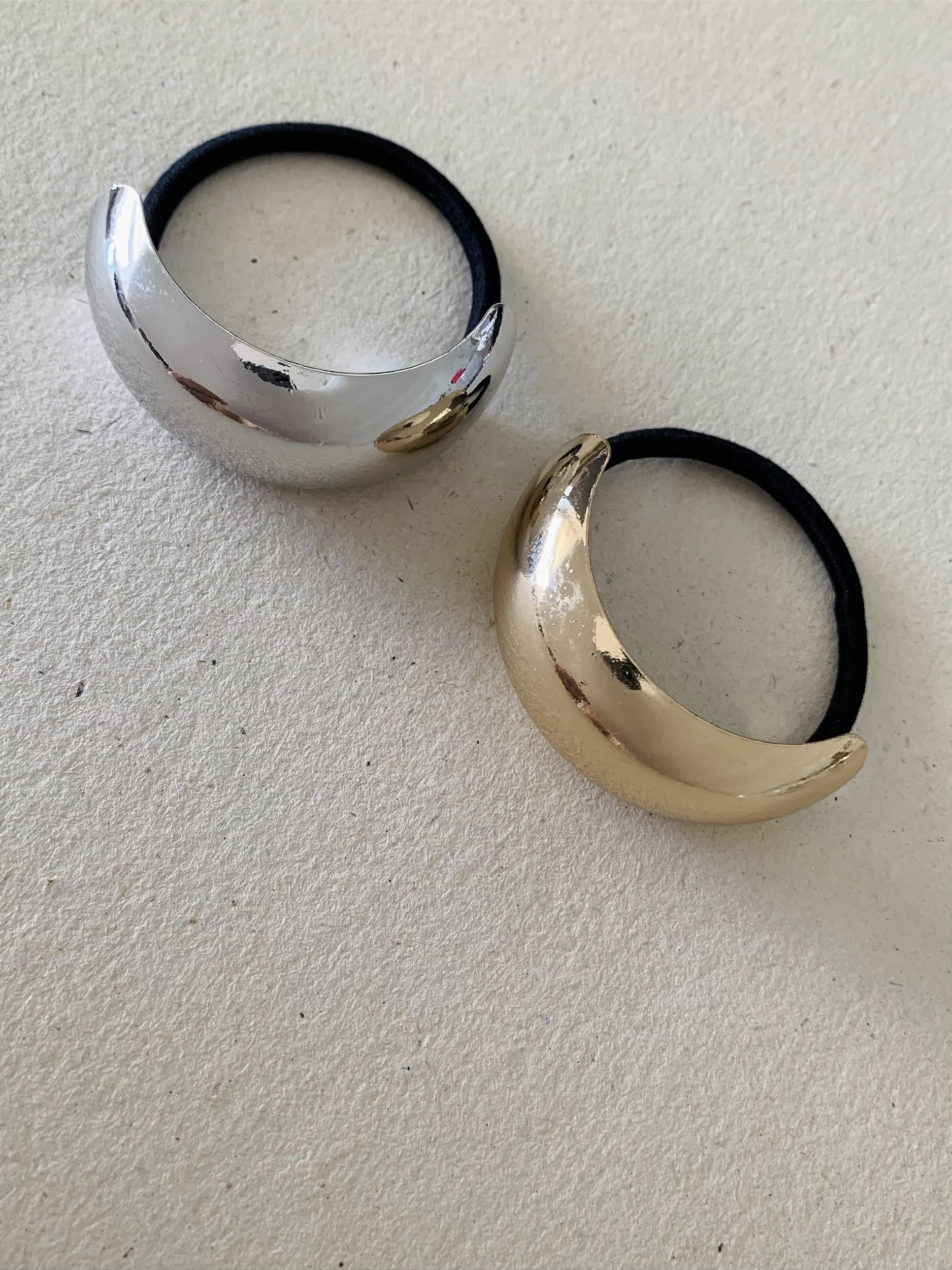 É composto por uma xuxinha preta cilíndrica e elástica comum e um adorno com base de metal dourado ou prateado.