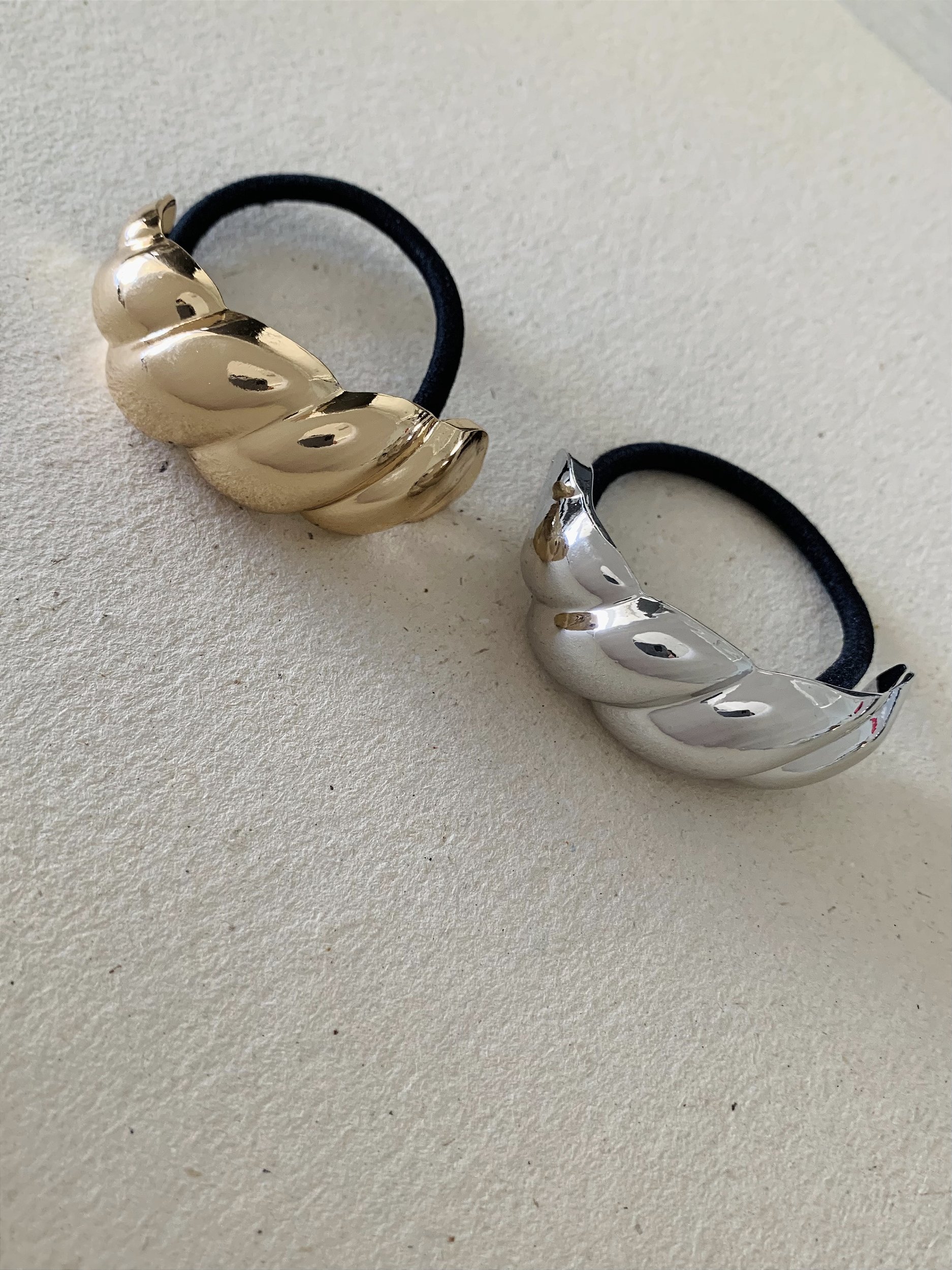 É composto por uma xuxinha preta cilíndrica e elástica comum e um adorno com base de metal dourado detalhado.