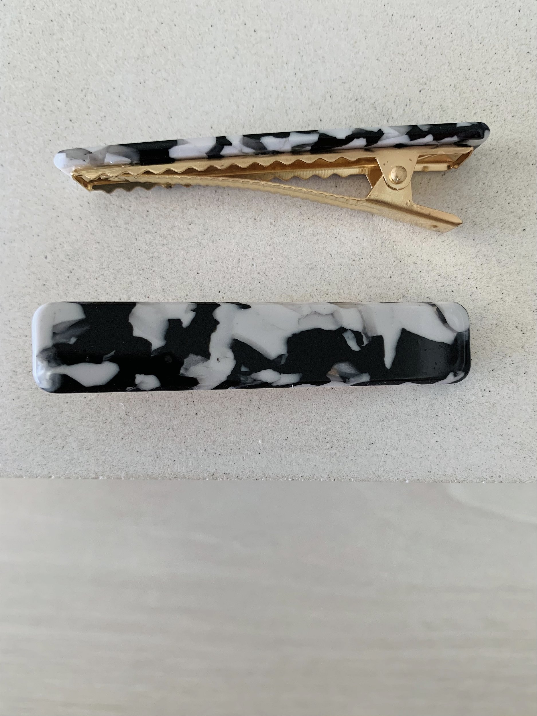 É uma presilha no estilo pinça/bico de pato, o que faz com o que ele prenda e fixe bem nos cabelos sem danificar.